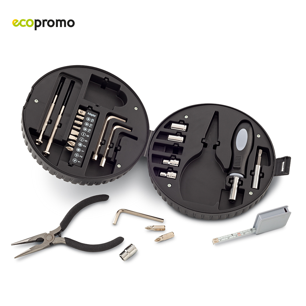 Set de herramientas de 24 piezas en estuche plástico y bambú. Cierre a presión. Empaque caja individual. Medidas Cerrado: 5.5 cm x 16 cm diámetro. Marca aproximada: 5 cm / Láser.