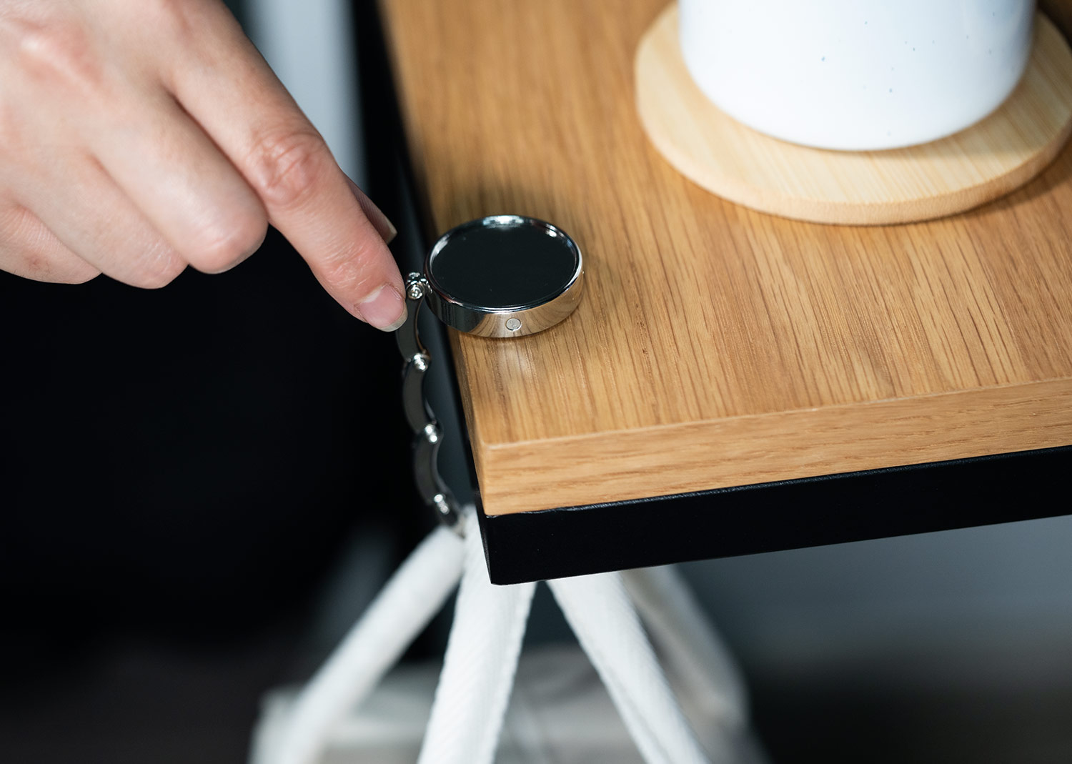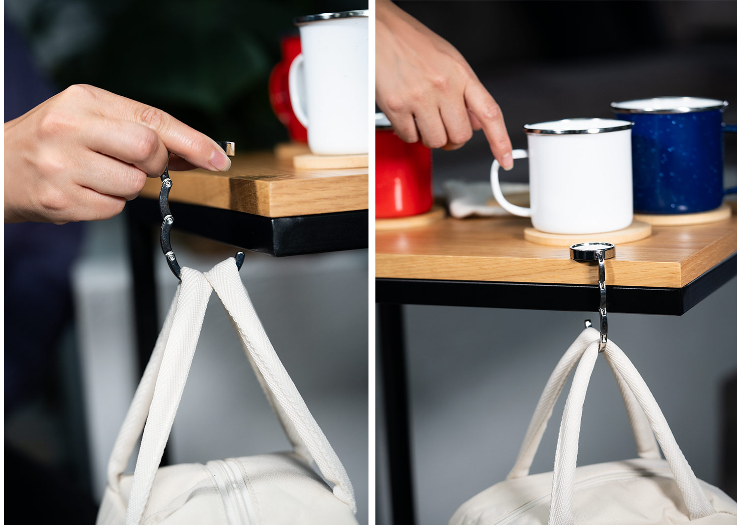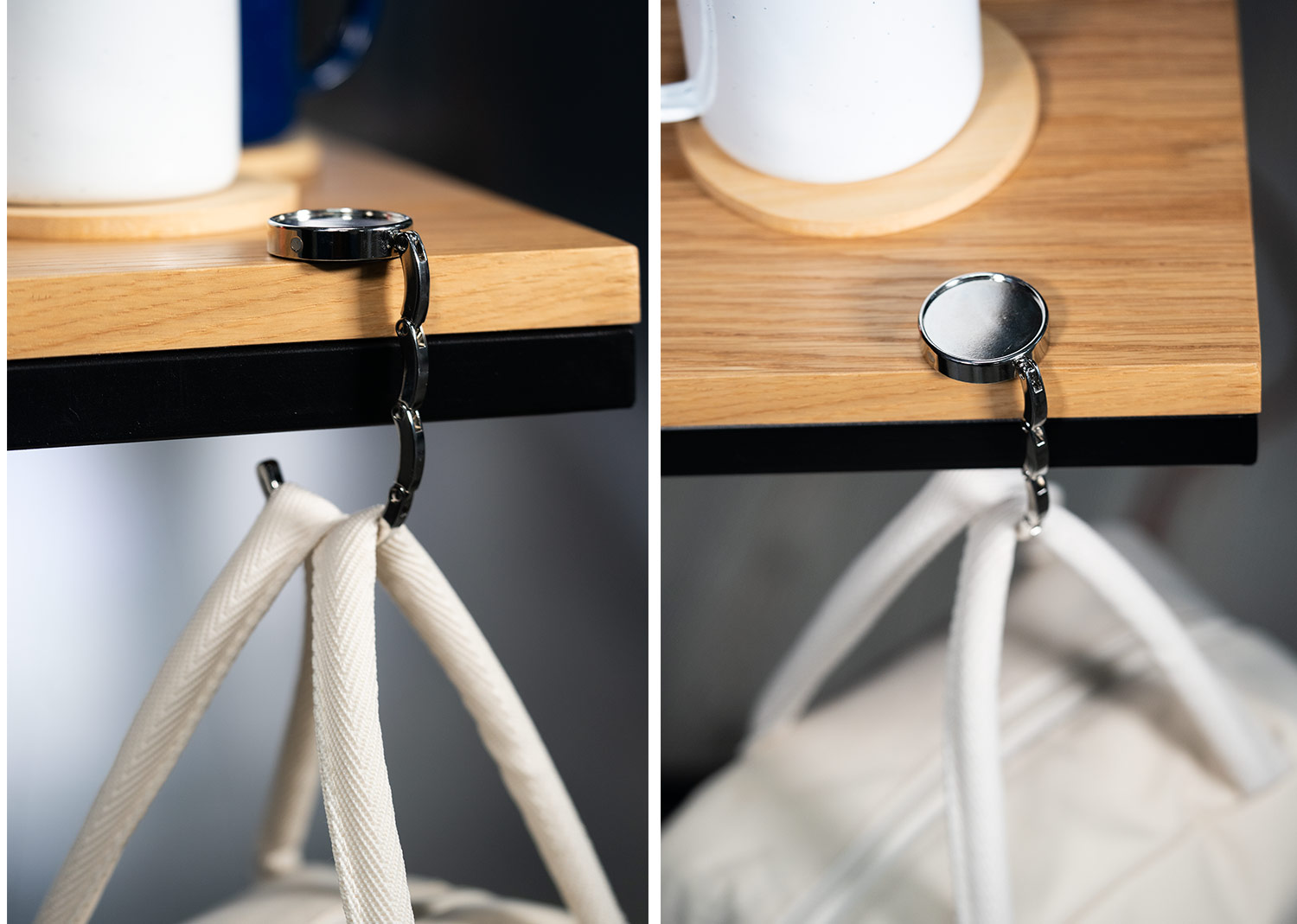 Anillo metálico porta bolsos, práctico y compacto. Diseñado para colgar bolsos de forma segura en el borde de cualquier mesa, manteniéndolos limpios y siempre a la mano. MATERIAL: Aleación Zinc + Acero Inoxidable. MEDIDAS: Cerrado: 4,5 cm. Abierto: 4,5 cm X 9,4 cm. ÁREA DE IMPRESIÓN APROXIMADA: Láser: 2,2 X 1,5cm. MARCA: Láser. EMPAQUE: 200 Unidades en caja máster de: 33 cm x 23 cm x 38 cm; Peso Bruto: 11 Kg; Peso Neto: 10 Kg. EMPAQUE INDIVIDUAL: Cada pieza en bolsa OPP.
