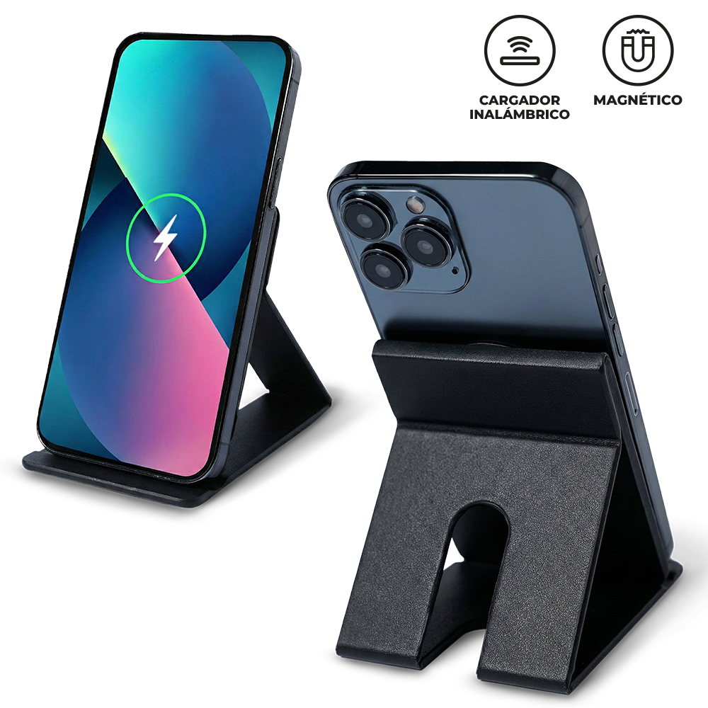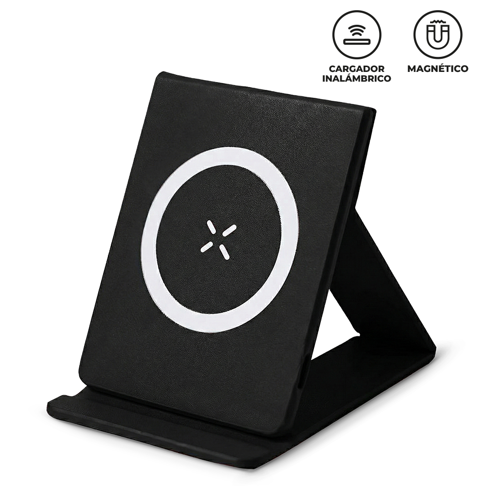 Cargador inalámbrico plegable en poliuretano de 15W. Incluye cable Tipo C para carga y anillo metálico adhesivo. Empaque Caja Individual. Medidas Cerrado: 10.6 cm x 7 cm x 1.2 cm. Marca aproximada: 4 cm / Screen / Tampografía.