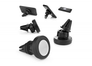 Holder para carro magnético. Incluye placa para adherir a la parte trasera del dispositivo móvil. Dentro de la base magnética son 4 imanes permanentes, que están alineados con precisión para maximizar la fuerza magnética más allá de corto alcance. Por lo tanto evita cualquier interferencia con su Smartphone y/o Tablet. Resistente no se cae el dispositivo, sin importar lo accidentado del camino. con rotación para facilitar la manipulación del dispositivo móvil. MATERIAL: TPR + ABS + Imán. MEDIDAS: Diámetro 4,4 x 6 cm. ÁREA DE IMPRESIÓN APROXIMADA: 2,2 x 2,2 cm. MARCA: En la placa metálica: Tampografía con tratamiento 1 tinta. EMPAQUE: 100 Unidades en caja máster de: 28,5 cm x 21,5 cm x 29,5 cm; Peso Bruto: 5,7 Kg; Peso Neto: 5,1 Kg.
