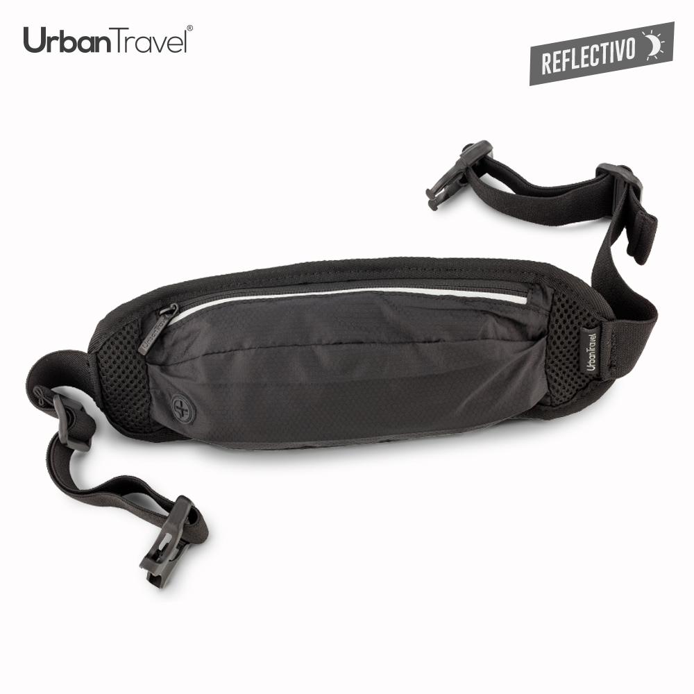Canguro en poliéster impermeable. Dos bolsillos con cremallera (uno externo y el otro interno), y salida para audífonos. Medidas: 32 cm x 10 cm. Marca aproximada: 10 cm / Screen.