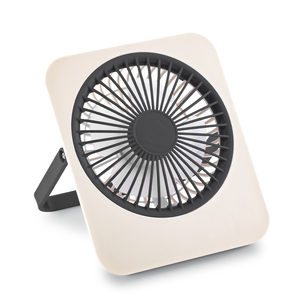 Mini ventilador plástico de escritorio con cable USB. Empaque caja individual. Medidas: 16.5 cm x 14 cm x 3 cm. Marca: 3.5 cm / Tampografía.
