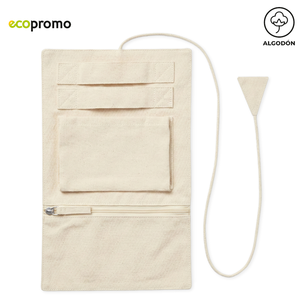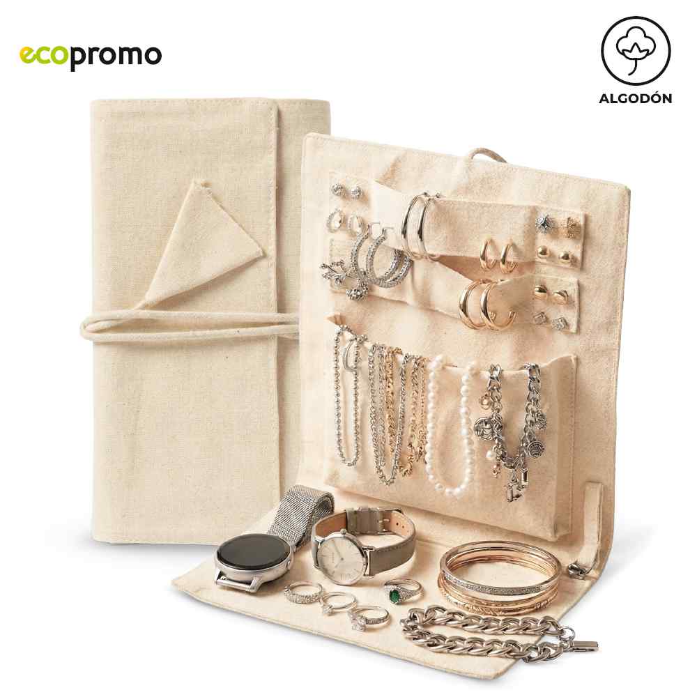 Joyero plegable en algodón. Incluye dos cintas para colgar objetos, un bolsillo sin cremallera y un bolsillo con cremallera. Incluye cordón para cerrarlo. Empaque Bolsa Individual. Medidas Abierto: 30 cm x 18 cm. Marca aproximada: 8cm / Screen.